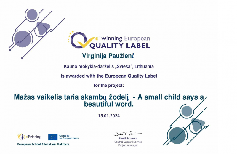 Sveikiname mokytojas, kurioms už projektinę veiklą suteikti Europos kokybės ženkleliai. Virginijai Paužienei už darbą eTwinning projekte „Mažas vaikelis taria skambų žodelį-a small child says a beautiful words” , Ingai Gancevskaitei „Tell Tale Land“ , Rasai Plesevičienei „105 small steps for Lithuania“ suteikti Europos kokybės ženklelis. Tai reiškia, kad mokytojų darbas, mokinių darbas ir bendradarbiavimas su partneriais atitiko Kokybės ženklelio sistemos kriterijus ir gavo aukštą balą.